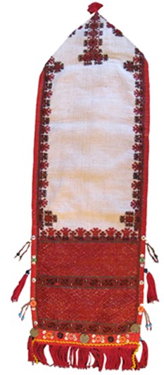 Päähineen kangas on pellavaa, reunakaitaleet punaista puuvillakangasta, punaiset kirjonnat on tehty löyhäkierteisellä silkkilangalla ja kuvioiden rajaukset mustanruskealla villalangalla.
