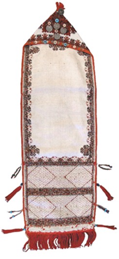 MARIEN kirjontatekniikoista omaleimaisin on kahdenneulan kirjonta, jota ommeltaessa on lähteiden mukaan käytetty kahta neulaa. Kuvioiden ääriviivat on ommeltu tummalla villalangalla ja kuvioiden sisukset täytetty löyhäkierteisellä punaisella silkkilangalla. Oheisen päähineen kärkiosassa ja sivuissa on tätä kahdenneulankirjontaa. Päähineen hännässä eli niskaan laskeutuvassa osassa on silkkilangalla kirjottua geometrista kuviopintaa, tekniikkana etupistopujottelu (vrt. meillä virvittäin ompelu) ja kapeilla laakapistoilla tehtyjä raitarivejä (meillä nuorasittain ompelu).