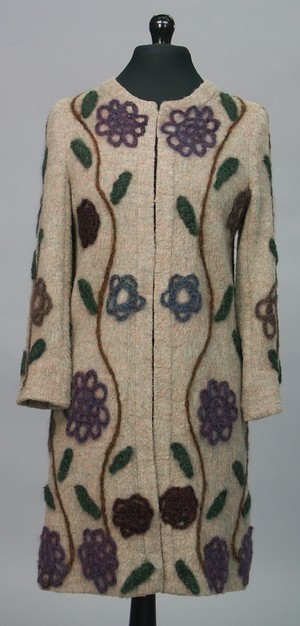 Kirjonta on muotisalongeille yleisesti ottaen poikkeuksellinen mutta neuleeseen hyvin sopiva. Ulla Bergh-Snellman on ideoinut kukkaisaiheen hippiuutisten ja flower power ‑iskusanojen innoittamana, ja sen on toteuttanut Margareta Kuntzi.