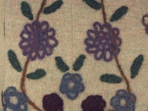 Takin materiaali on mohairsekoitteista villalankaa, samoin virkatut applikaatiot.