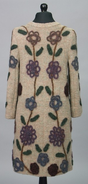 Kirjonta on muotisalongeille yleisesti ottaen poikkeuksellinen mutta neuleeseen hyvin sopiva. Ulla Bergh-Snellman on ideoinut kukkaisaiheen hippiuutisten ja flower power ‑iskusanojen innoittamana, ja sen on toteuttanut Margareta Kuntzi.