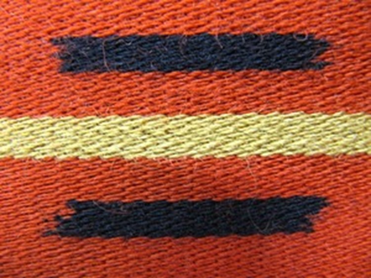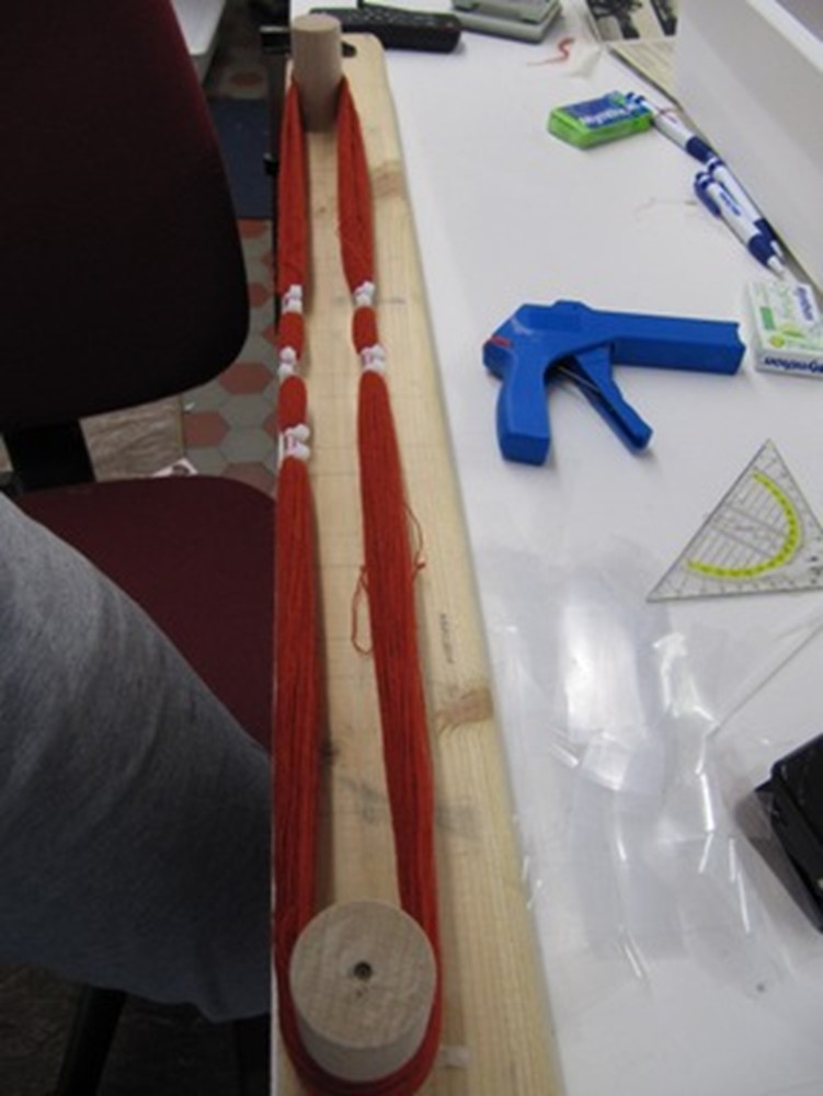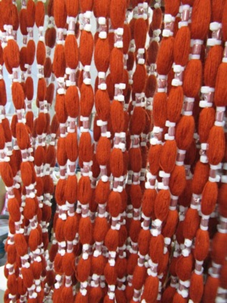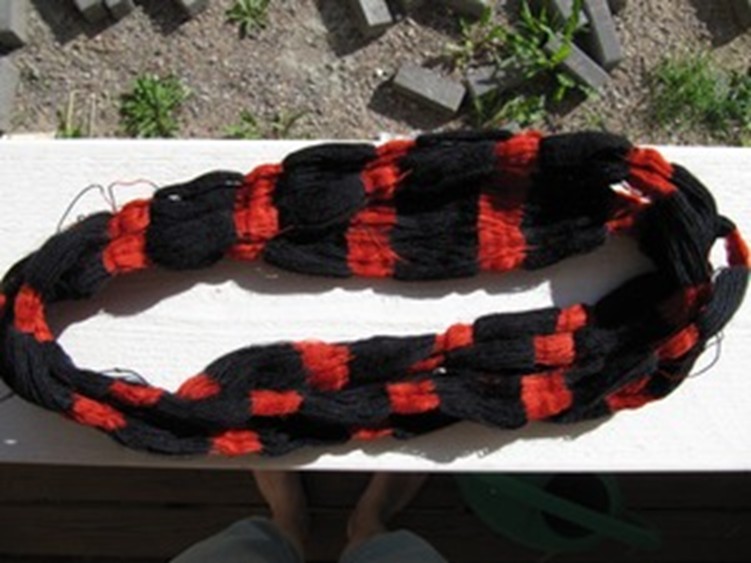 Koska Mouhijärven hameeseen tarvittava flammulanka on punaista ja värjäytyvät kohdat värjätään sinisiksi, täytyy saman sävyn saamiseksi sinisiin raitoihin tulevat langat myös värjätä punaisesta langasta. Niinpä värjättäväksi lähetetään sidotut flammuvyyhdit ja osa punaisista langoista.