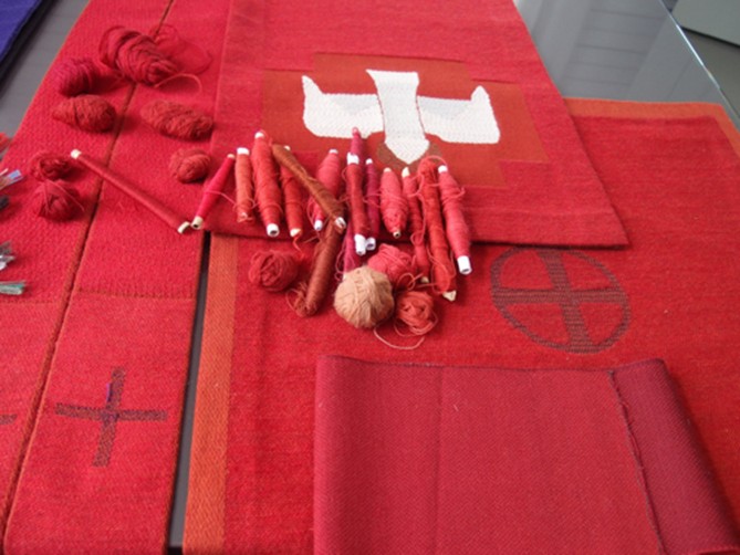 Oli todella mielenkiintoista tutustua Dora Jungin tekstiilien symboliikkaan ja sidoksiin sekä etsin tekstiileissä käytettyjä värejä lankakarttojen ja mallitilkkujen avulla. Näin suunnittelutyö lähti hienosti liikkeelle.