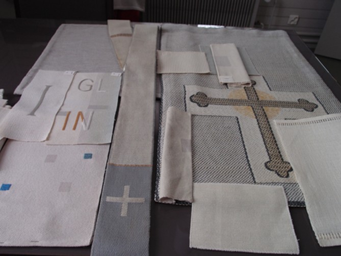 Töölön kirkosta oli siirretty Oulunkylän kirkkoon Dora Jungin suunnittelemia kirkkotekstiilejä. Vuoden 2013 alussa sain tehtäväkseni suunnitella niihin sopivat uudet alttarivaatteet, stolat ja bursat sekä valkoiseen sarjaan myös kalkkiliinan.